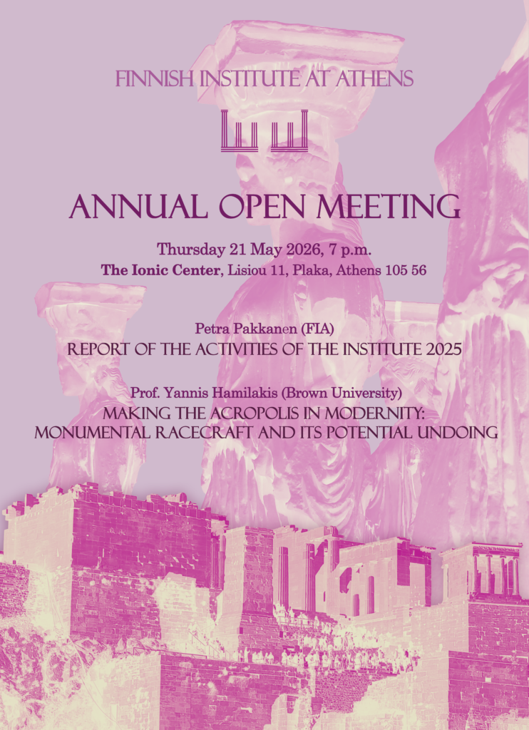 Η διευθύντρια Petra Pakkanen θα παρουσιάσει τις δραστηριότητες του Ινστιτούτου που έλαβαν χώρα το 2025. Θα ακολουθήσει ομιλία του Καθ. Γιάννη Χαμηλάκη (Brown University) με τίτλο “Making the Acropolis in Modernity: Monumental Racecraft and its Potential Undoing “.