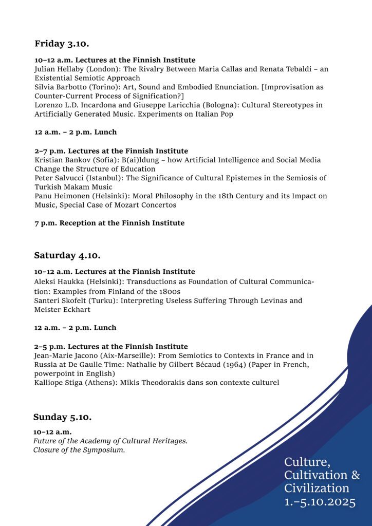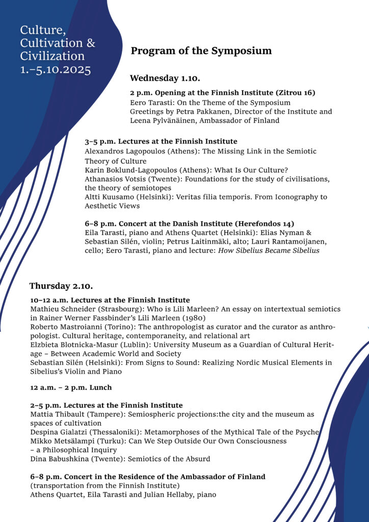 Finnish Institute at Athens hosts an international 5-day event in the beginning of October. The program consists of lectures and concerts that will travel you deeper into the theme of the symposium. Additional concerts will take place at the Danish Institute at Athens and the residence of the Finnish Ambassador.